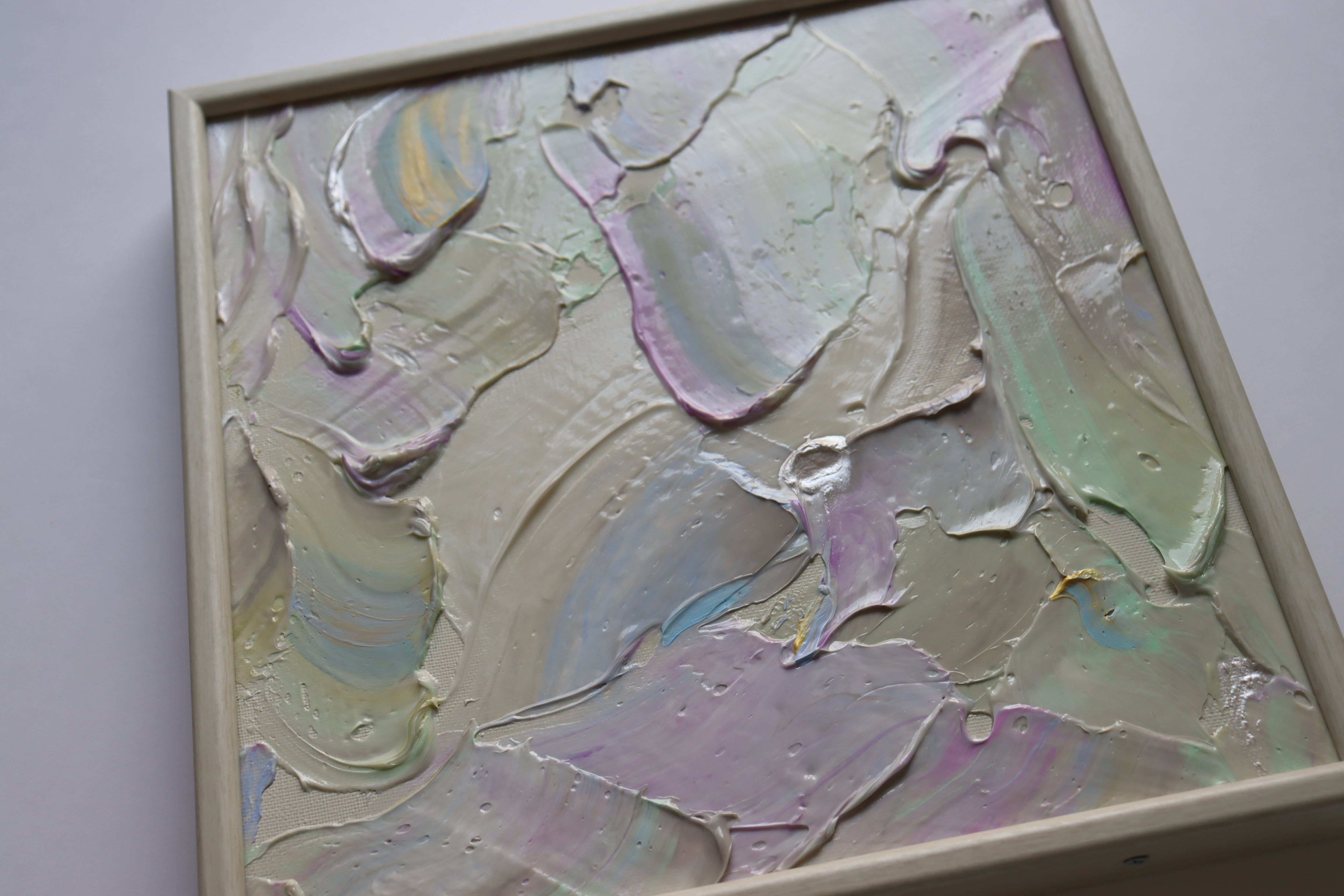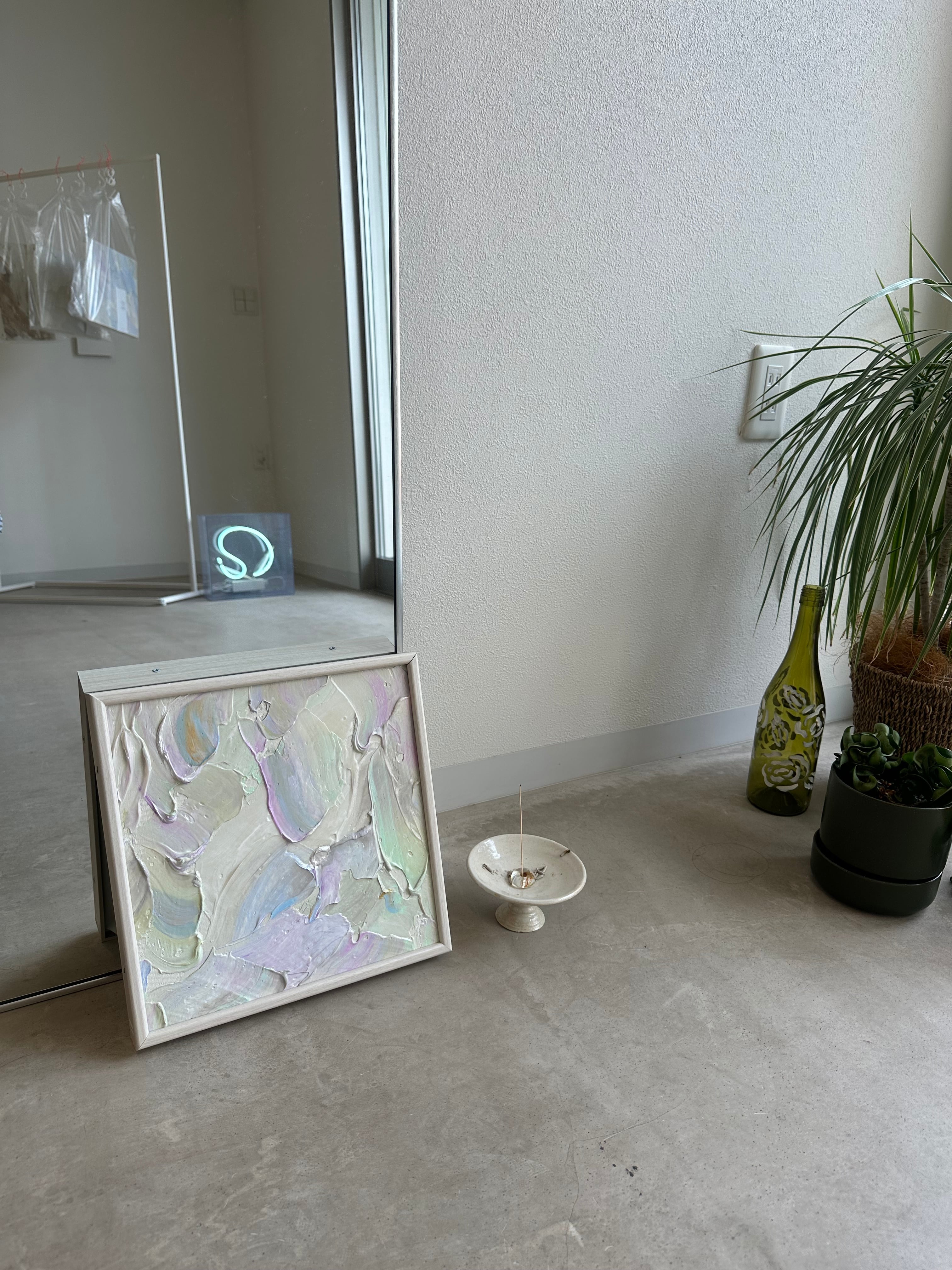 希望や差し込む光のようなパールの輝きと、空のグラデーションのような優しいパープルやグリーンを合わせた作品です。