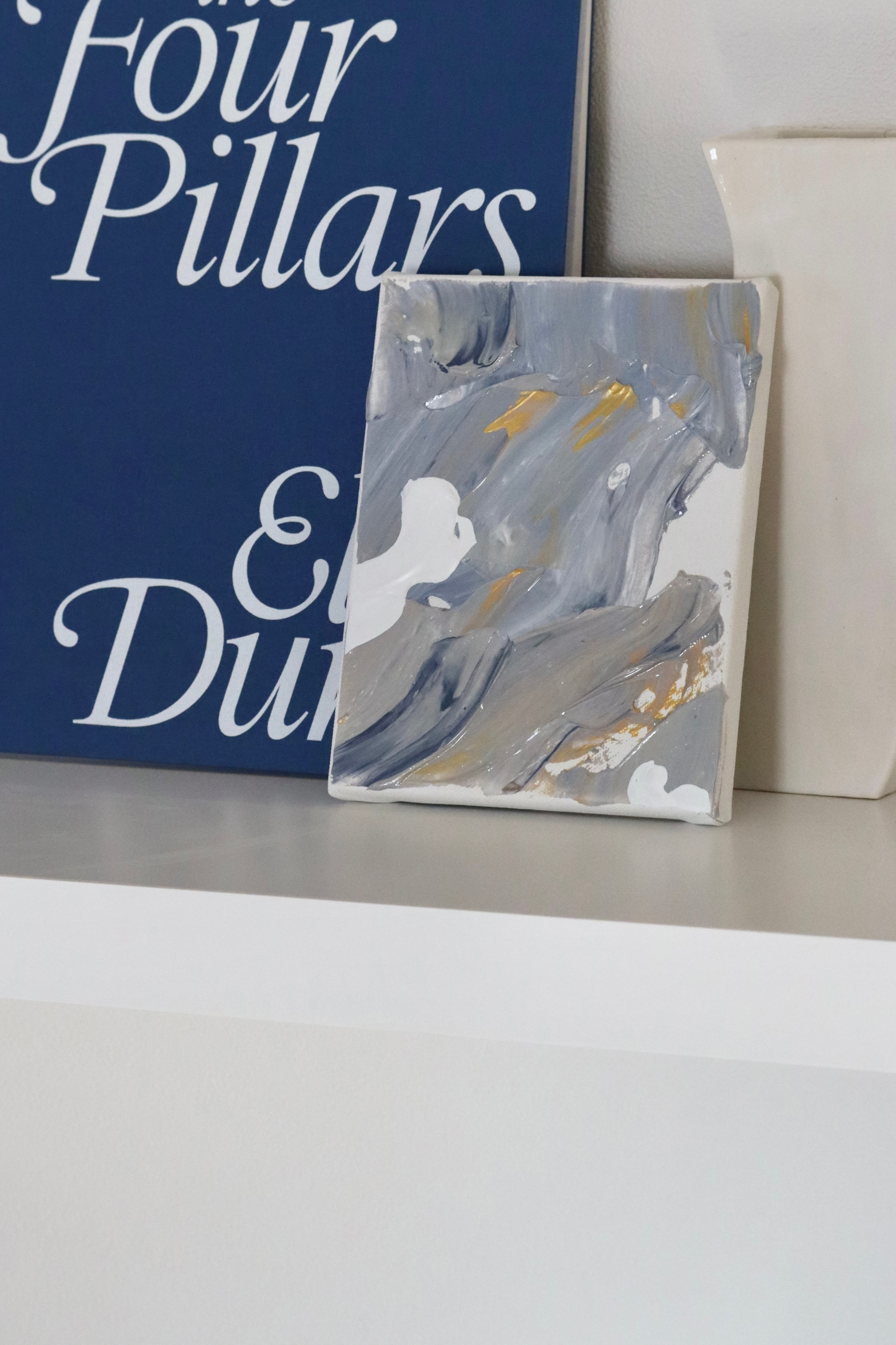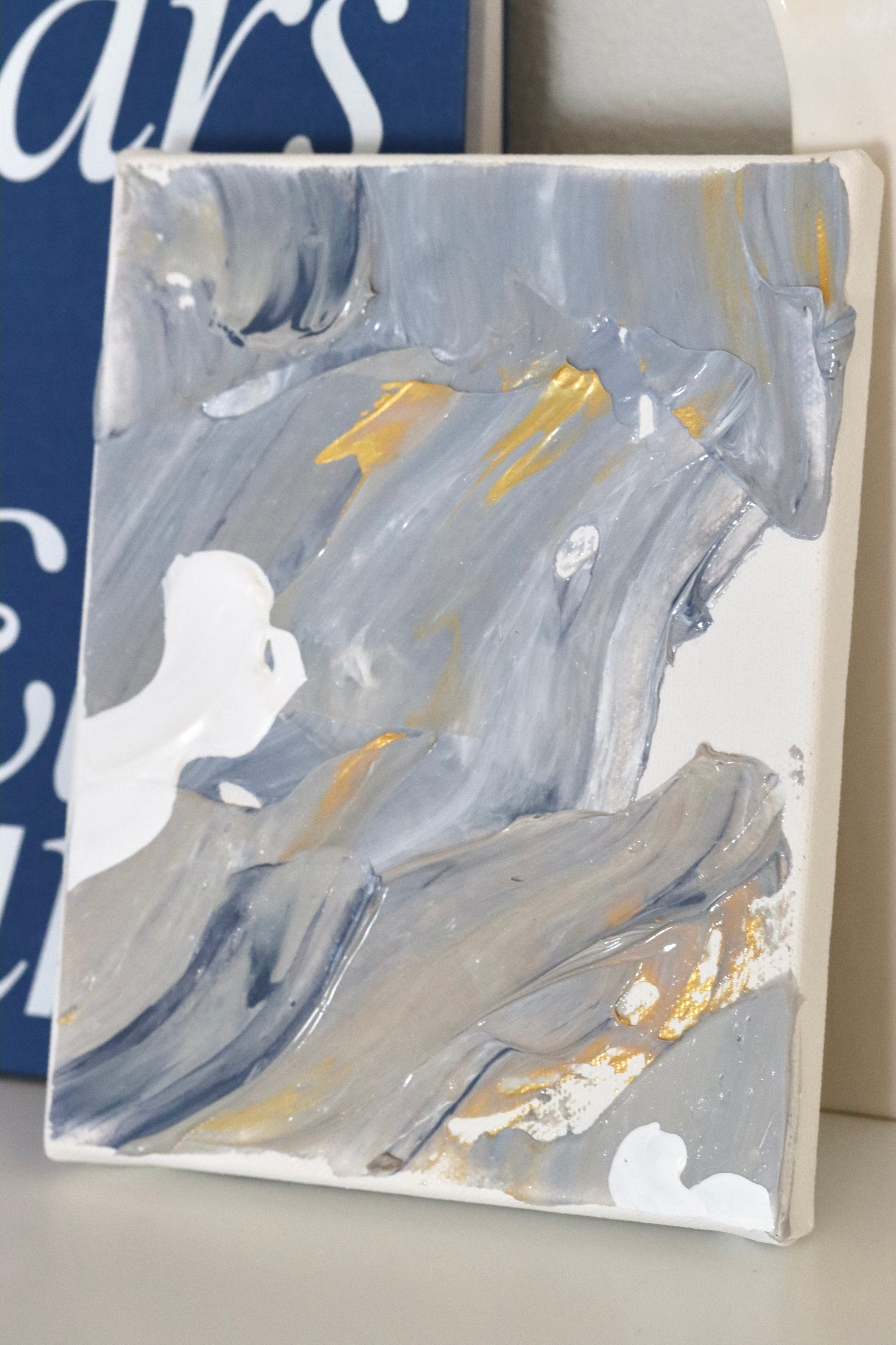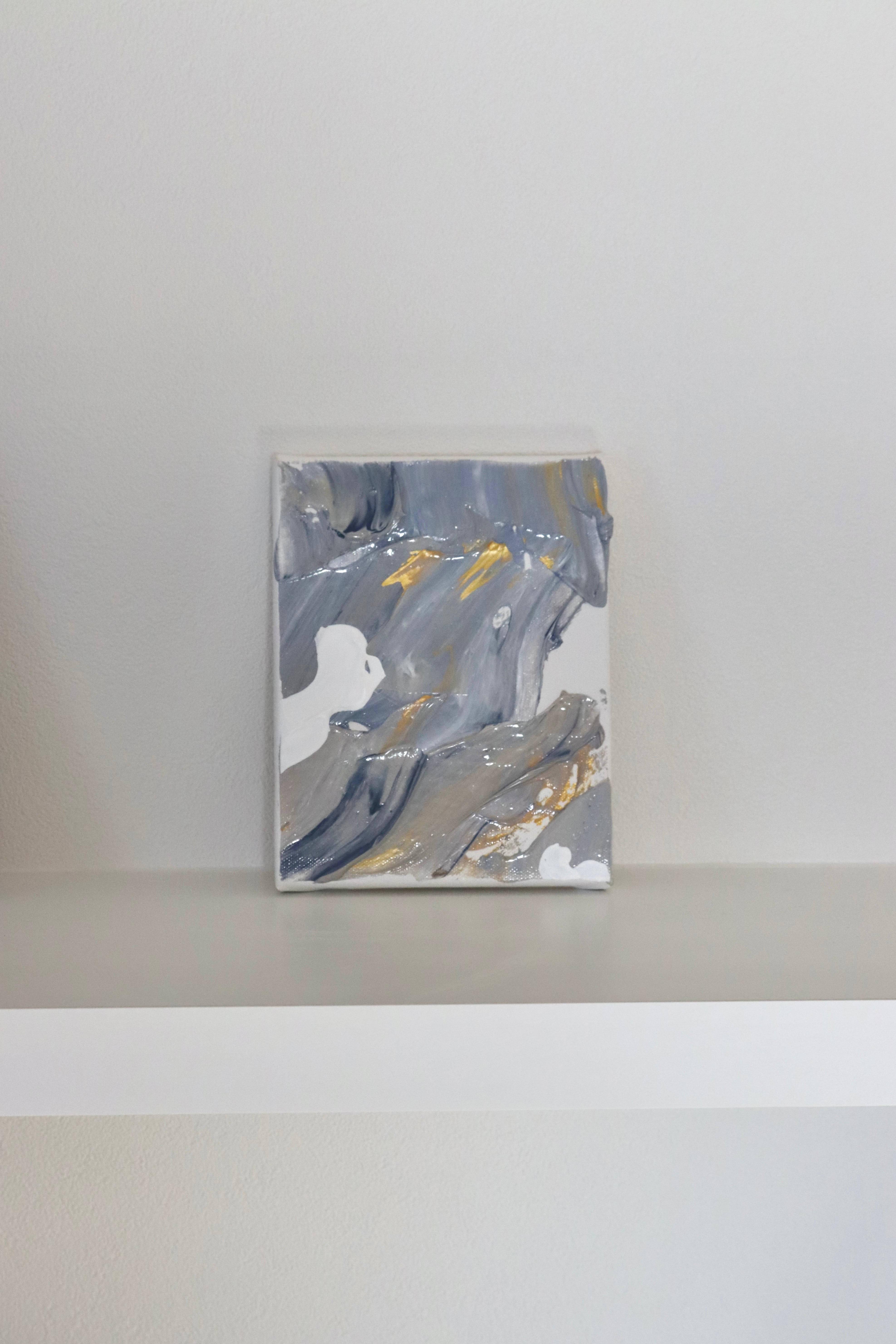 煌めくゴールドをアクセントに空を描きました。アンニュイなブルーの上に、雲が浮かびます。角度によって異なる煌めきをお楽しみください。