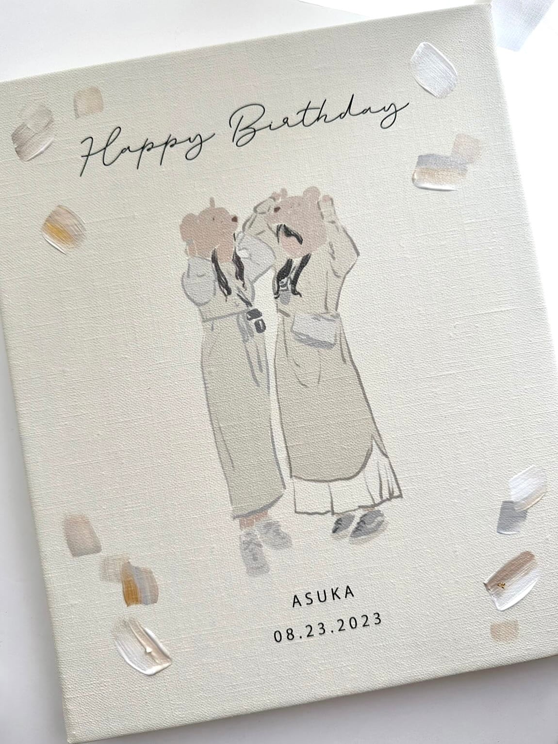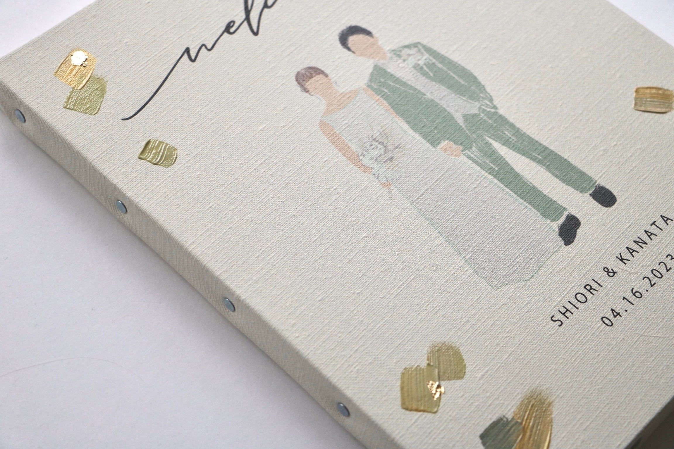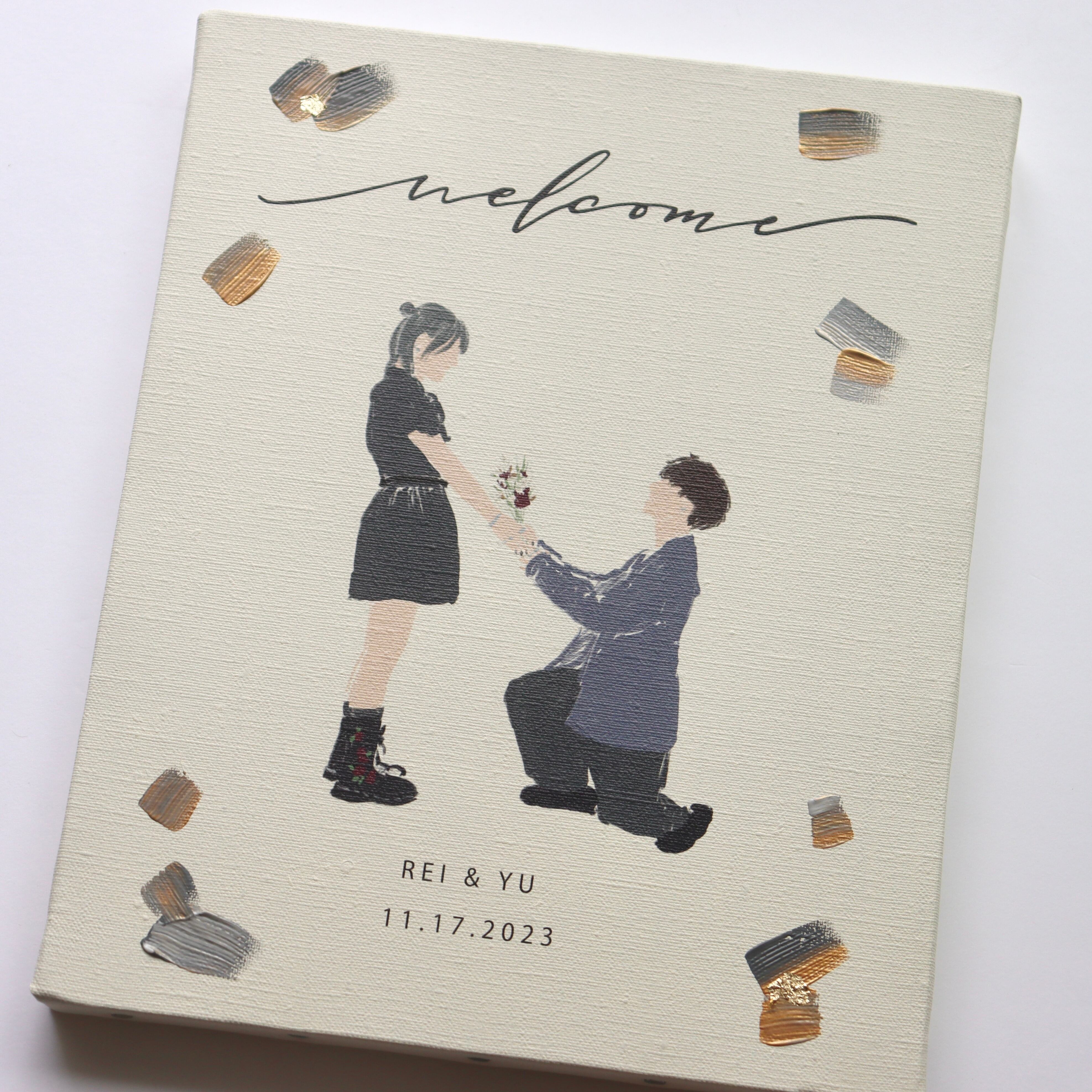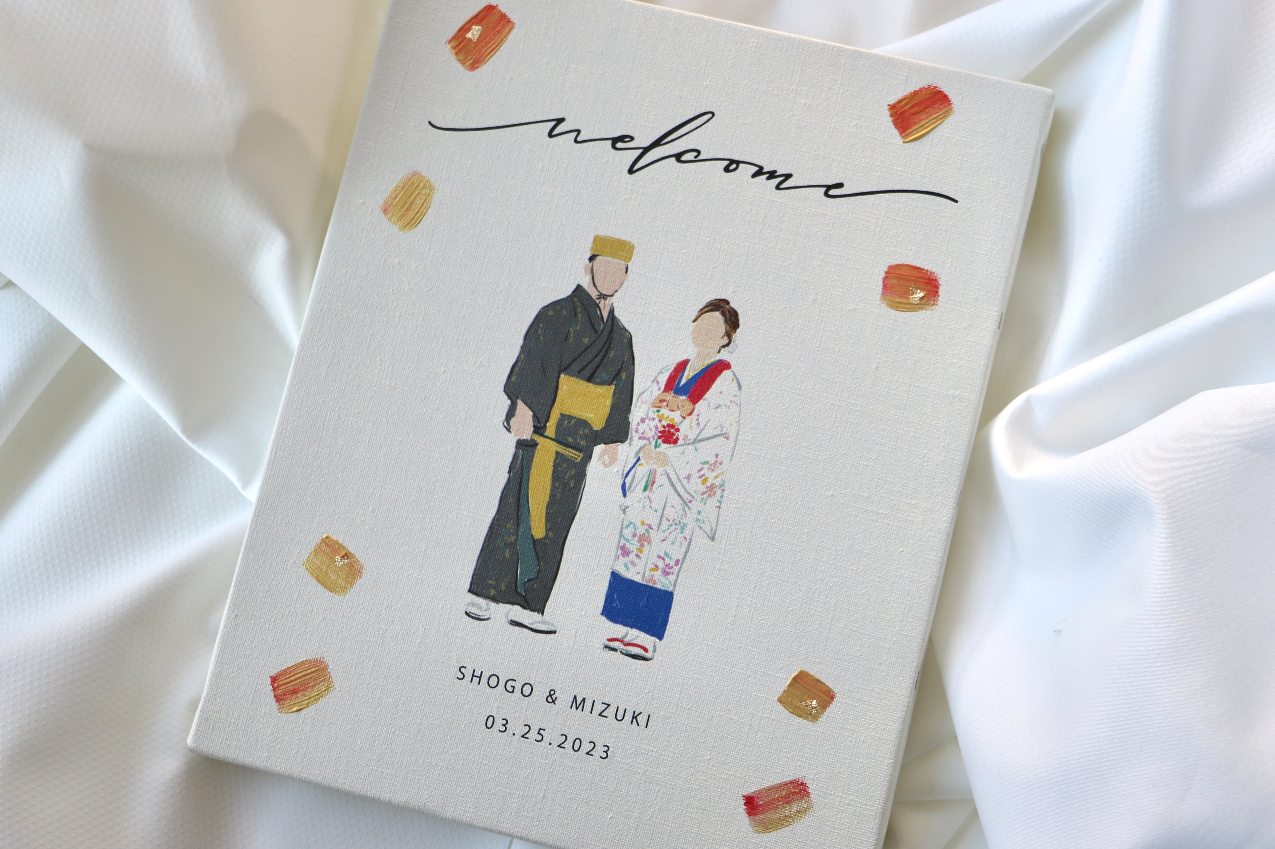 お二人のイラストと、手描きの絵の具を合わせたウェルカムボードです。式が終わってもインテリアとしてお楽しみいただけます。